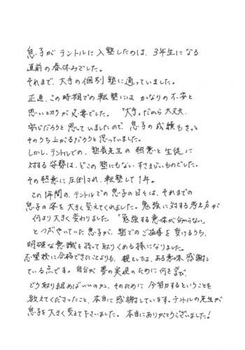 しかし、テントルでの、塾長先生の熱意と生徒に対する姿勢は、どこの塾にもないすさまじいものでした。その熱意に圧倒され転塾して1年。この1年間のテントルでの息子の日々はそれまでの息子の姿を大きく変えてくれました。勉強に対する考え方が何より大きく変わりました。”勉強する意味が分からない”とつぶやいていた息子が、塾でのご指導を受けるうち、明確な意識を持って取りくめるようになりました。志望校に合格できたことよりも、親としてはある意味感謝している点です。自分が夢の実現のために何を学び、どう取り組めばいいのか。そのために、今努力するということを教えてくださったことに、本当に感謝しています。テントルの生成が息子を大きく変えて下さいました。本当にありがとうございました。