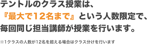 テントルのクラス授業は、「最大で12名まで」(※1クラスの人数が12名を超える場合は、クラス分けを行います。)という人数限定で、毎回同じ担任講師が授業を行います。