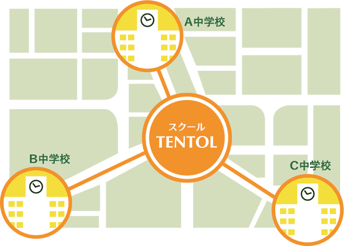 そこでテントルは、『1校舎あたり3中学校』を対象として、過去に実際に出題された問題や先生の板書、授業の進め方などから傾向を読み取り、予想される問題にポイントを絞って、中学校別の定期テスト対策を行っています。