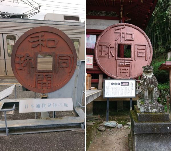 和同遺跡の最寄り駅となる秩父鉄道の和銅黒谷駅や近辺の聖神社には、和同開珎のオブジェが飾られています。