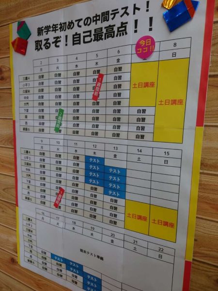 東久留米校では、先週に東久留米中央中・久留米中・大門中・三鷹4中・小平3中で中間テストが実施されました。今週は東久留米西中・南中・下里中・新座6中および各高校での中間テストが始まります。