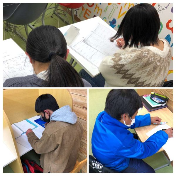 今日も、授業がない東久留米中央中と南中の中1生たちが、3学期の期末テストへ向けて自習に来て勉強を頑張っています。