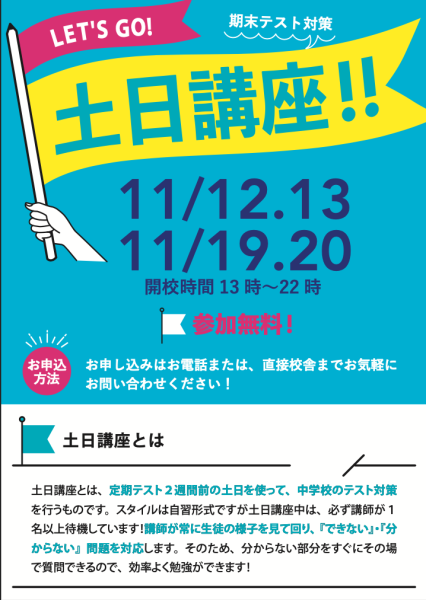 上記の日程で対策を行っていますので、土日は学校のワークを持って、ぜひテントルにお越しください!