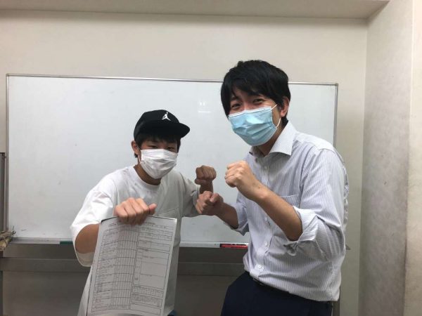 (↑は中3生のR君!通知表で入塾時よりも“8”UP! 喜びのポーズで記念撮影!)