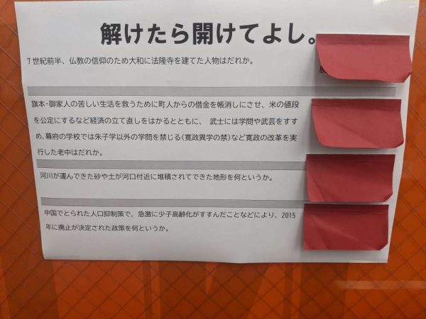 ↑中3生用に、毎日日替わりで社会の暗記チェックを行っています。この積み重ねが、当日の力になるはず!