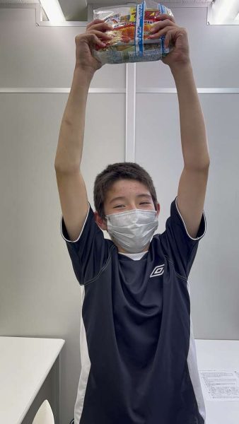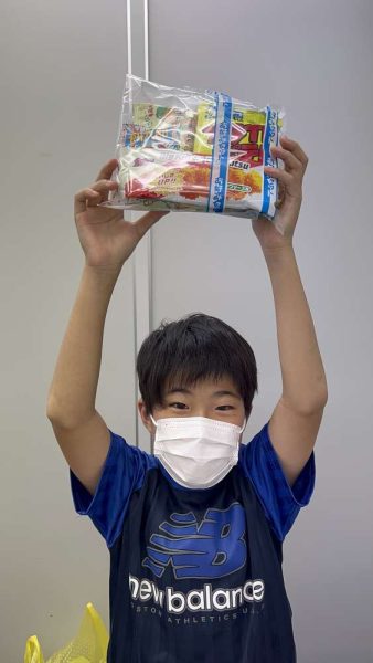 参加賞の駄菓子セットを嬉しそうに掲げてくれています笑