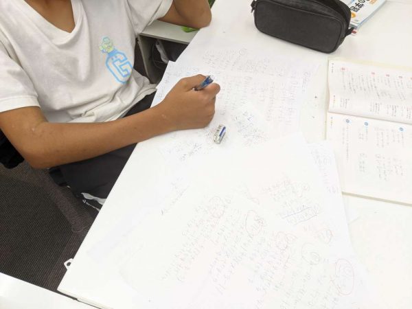 ↑テスト対策中の一コマ。ミスがなくなるまで、繰り返し学習。机に計算用紙があふれるまで、何度も繰り返し練習中です!
