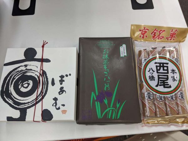 ↑生八つ橋、乾燥八つ橋、京ばうむ。どれも大好物のお土産です。テントル講師陣でおいしく頂きました!