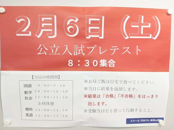 ↑来週末に中3生対象の公立入試プレテストを行います!受験生にとっては、これが最後の模擬テスト。当日に合否判定の返却も行うため、今から緊張している生徒もちらほら…。
