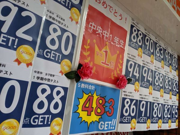 ↑テスト後には、入り口の掲示がテントル生達の嬉しい点数報告でいっぱいになることも!