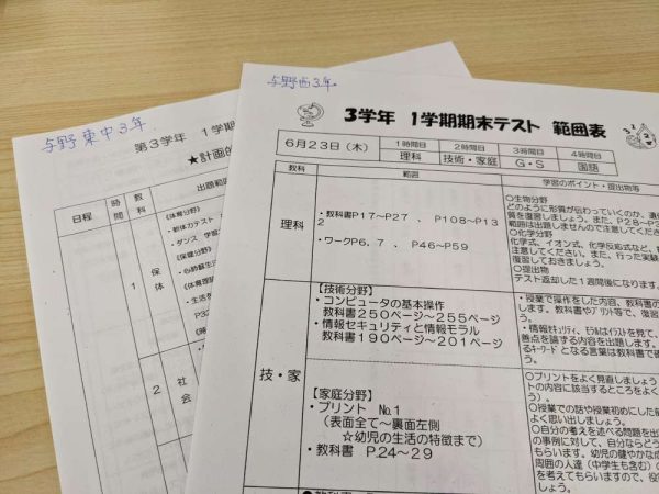 どの学校も、1学期中間テストの内容を含めたテスト範囲となる教科が多いようです。