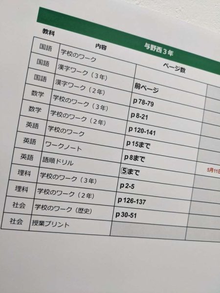 そして、各学校の勉強リスト。テスト範囲から、勉強が必要な内容を一覧にして掲示しています。