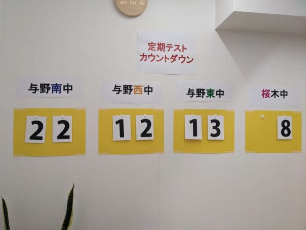 与野校では、定期テストをより盛り上げるために、校舎内に色々な掲示物を設置しています。