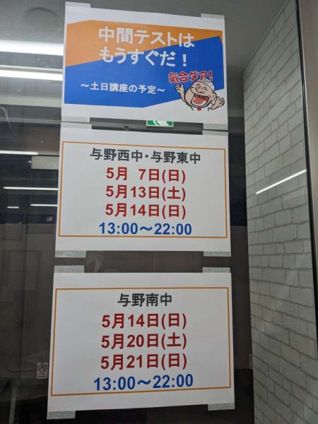 タイトルの通り、与野西中・与野東中が1学期中間テストの2週間前となりました!