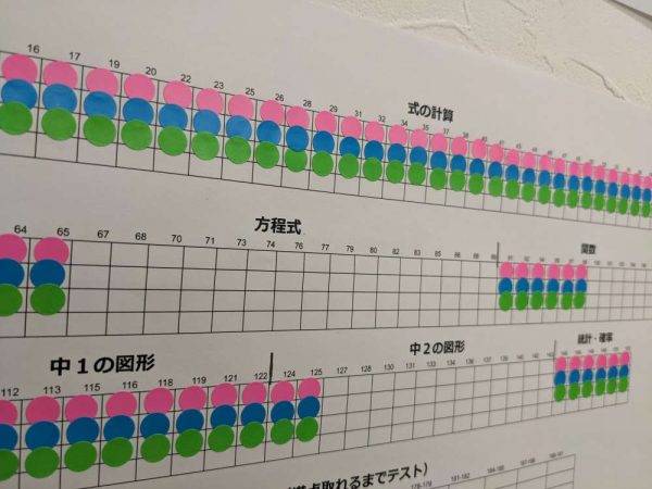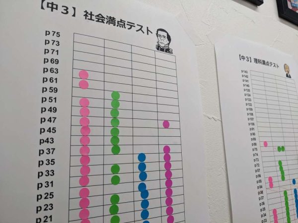 ↑暗記課題の進捗状況を校舎内に貼り出しています。各生徒、この表を見ながら自習時間に各自の暗記・演習課題を進めていきます。