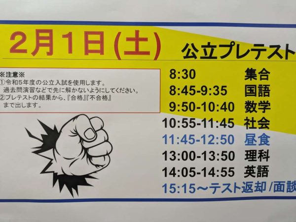 そんな中、今週の土曜日には「公立入試プレテスト」を実施! これは、本番の試験時間・スケジュールに合わせて行う模試で、入試当日の流れを体験することができます。