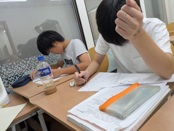 どの生徒も最後の確認に集中し、ノートやプリントを何度も見返しながら必死に取り組んでいます。